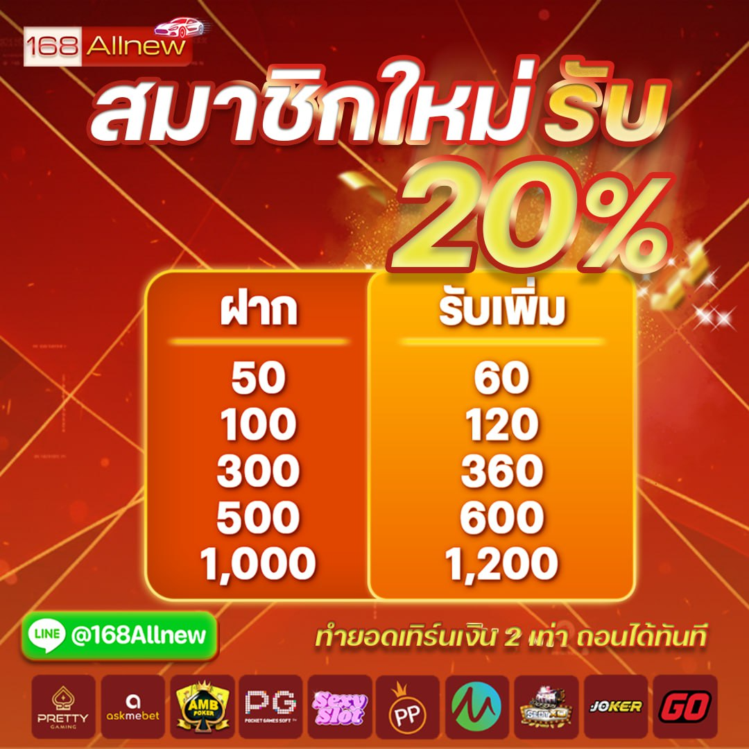 168allnew พร้อมมอบประสบการณ์การเดิมพันออนไลน์ที่คุ้มค่าที่สุดให้กับสมาชิกทุกท่าน ด้วยโปรโมชั่นสุดพิเศษที่คัดสรรมาเพื่อนักเดิมพันโดยเฉพาะ เริ่มต้นด้วยโบนัสต้อนรับสมาชิกใหม่สุดคุ้มถึง 100% ที่จะช่วยเพิ่มทุนในการเดิมพันของคุณให้มากขึ้น เพียงสมัครสมาชิกและทำการฝากเงินครั้งแรก คุณก็จะได้รับเครดิตเพิ่มทันทีตามยอดฝาก